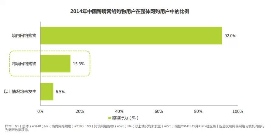 根据艾瑞咨询2014年中国跨境网络购物的调研数据,在网民的购物行为中,92.0%的网购用户在2014年内进行过“境内网络购物”,而进行过“跨境网络购物”的网购用户的比例为15.3%,在整体的占比较少。