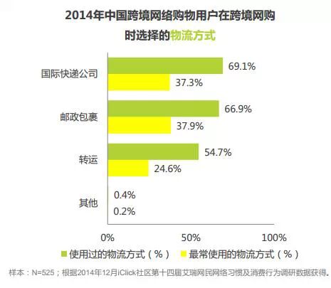 2014年中国跨境网络购物用户在跨境网购时使用过的物流方式主要是“国际快递公司”、“邮政包裹”以及“转运”