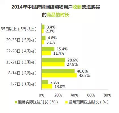 从数据可以看出,跨境网购商品的送达时长比用户的预期要稍微长一些。目前看,2~3周时间通常较为常见,用户也还能接受。不过,希望将来送货时长可以再缩短,谁不希望送货越快越好呢?